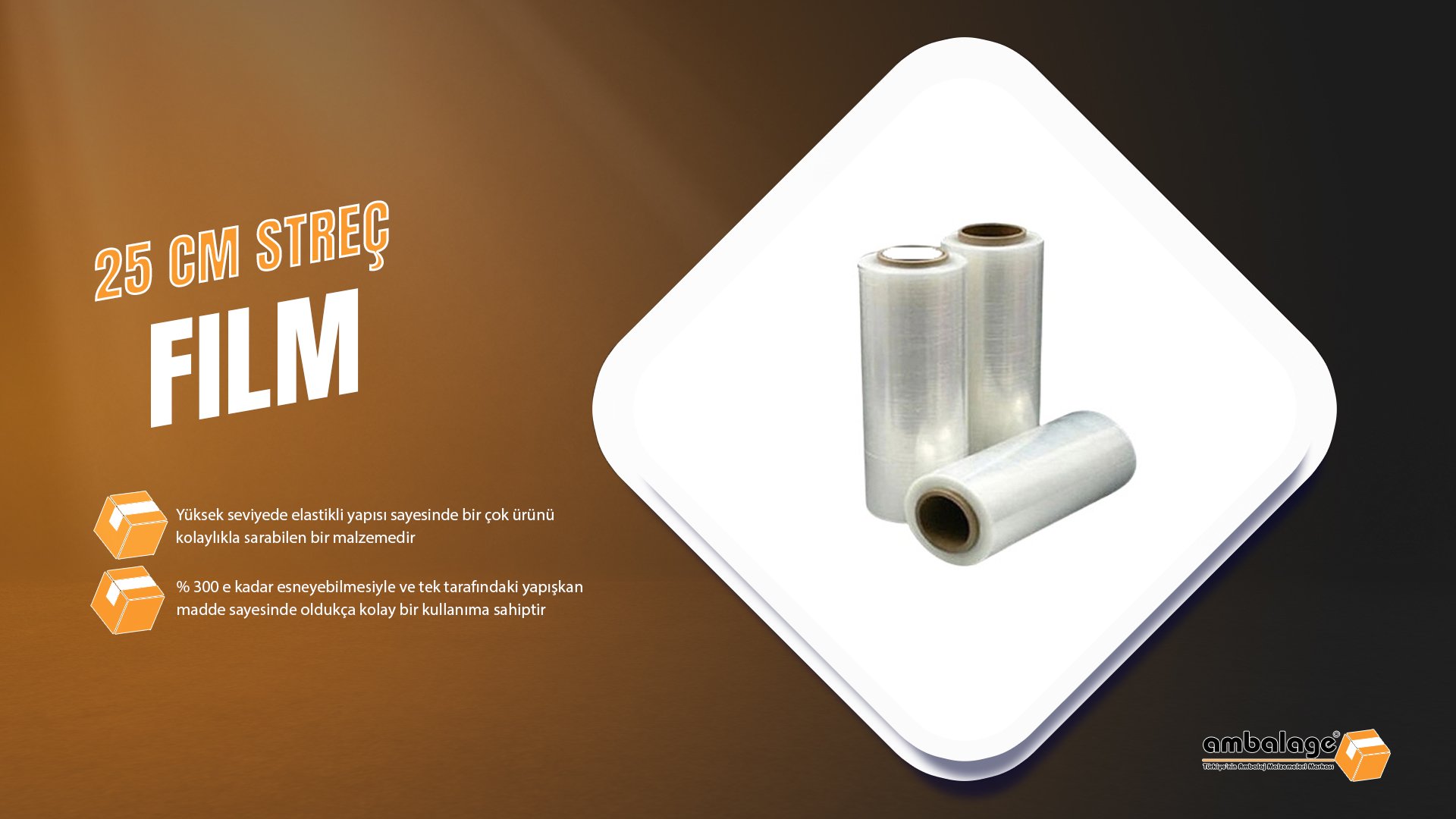 Yüksek seviyede elastiki yapısı sayesinde birçok ürünü kolaylıkla sarabilen bir malzemedir. % 300 e kadar esneyebilmesiyle ve tek tarafındaki yapışkan madde sayesinde oldukça kolay bir kullanıma sahiptir. 17 ve 23 micron kalınlıklarda ve çeşitli uzunluklarda streç film bulunmaktadır.