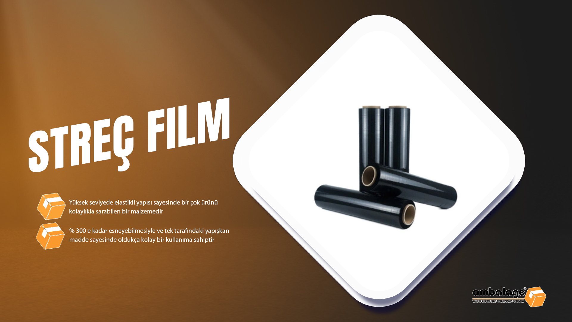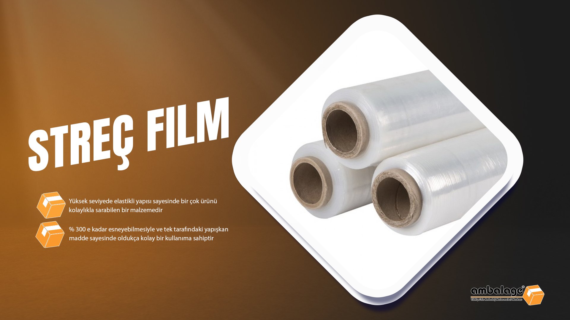 Yüksek seviyede elastik yapısı sayesinde birçok ürünü kolaylıkla sarabilen bir malzemedir. %300'e kadar esneyebilmesiyle ve tek tarafındaki yapışkan madde sayesinde oldukça kolay bir kullanıma sahiptir. 17 ve 23 micron kalınlıklarda ve çeşitli uzunluklarda streç film bulunmaktadır.